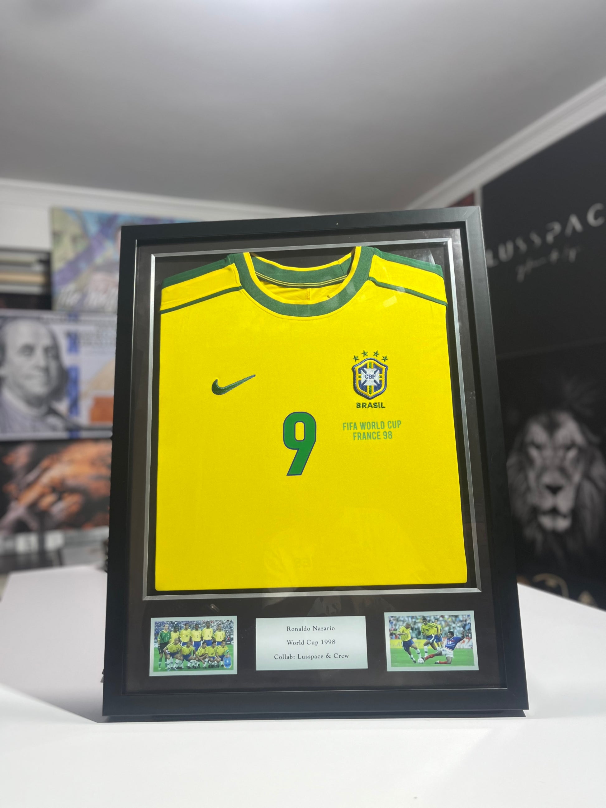 Esta camiseta icónica fue marcada totalmente a mano y enmarcada como una pieza de culto.